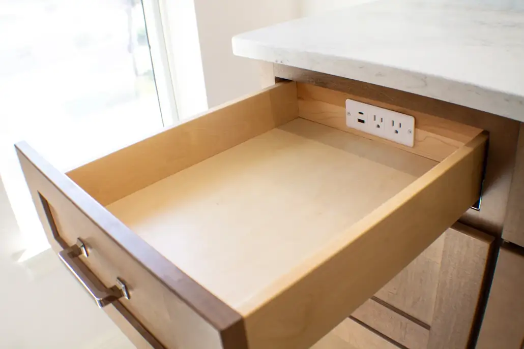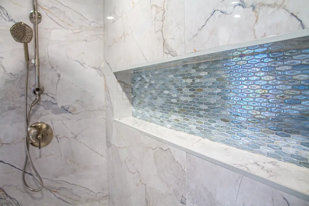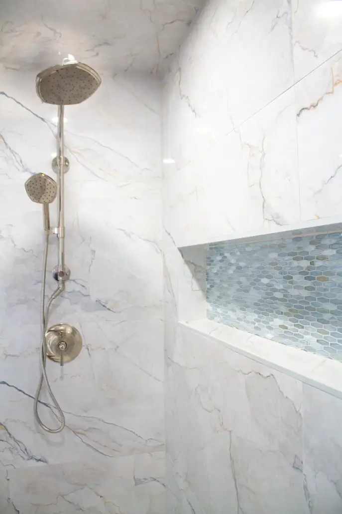 We replaced the dark finishes with light wood–stained shaker cabinetry, designed with integrated drawer outlets to maintain a clean, streamlined aesthetic. Polished nickel Moen plumbing fixtures were selected for their timeless elegance and coastal-inspired sheen. To create a seamless, high-end environment, we installed polished 24×48″ Statik Blend tile, minimizing grout lines and establishing a smooth, uninterrupted visual surface. All trim and doors were updated to a crisp white, dramatically brightening the room and completing the transformation into an airy, sophisticated retreat.